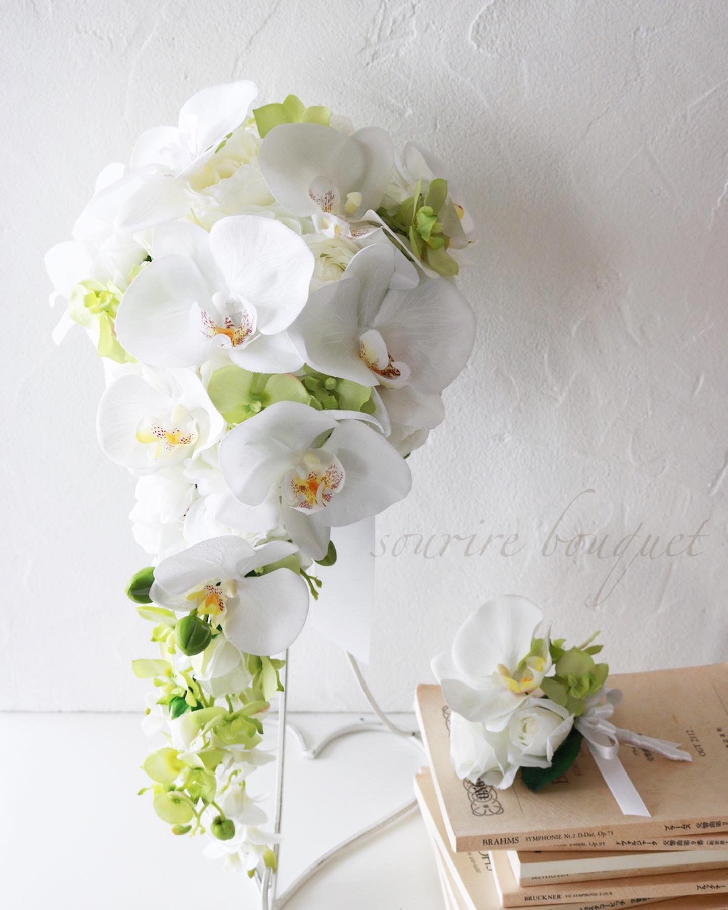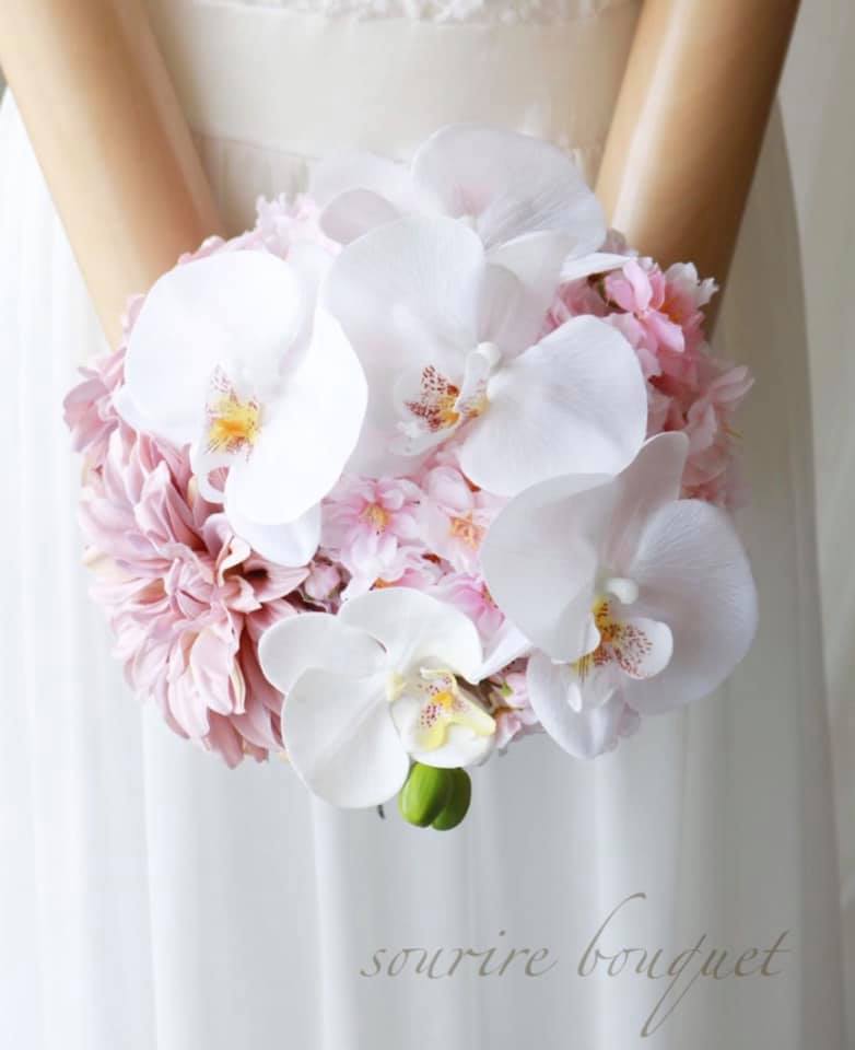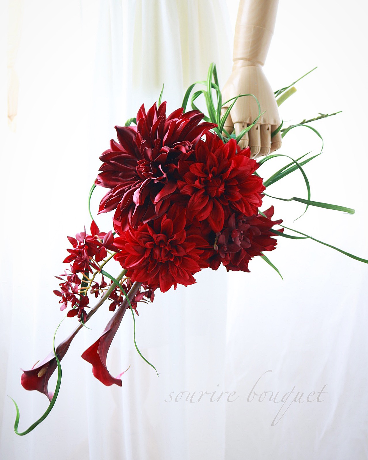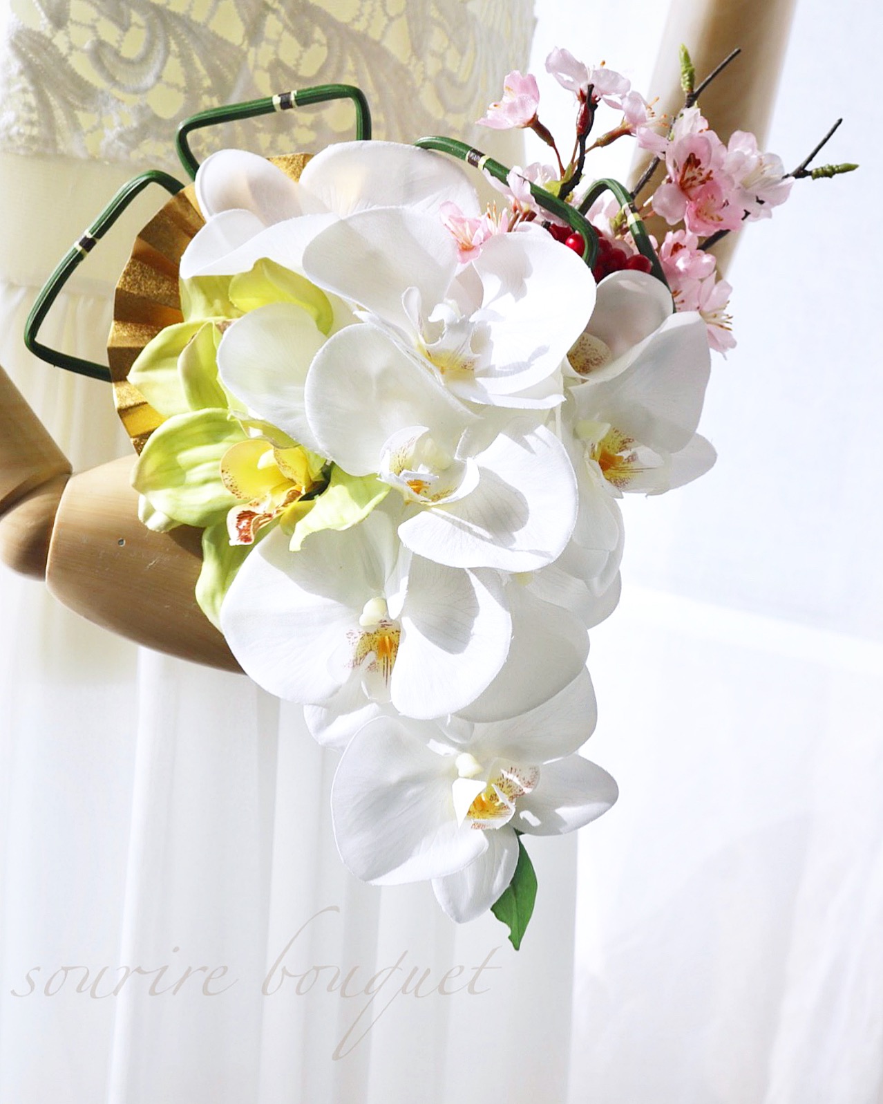 菊(マム)や、胡蝶蘭、桜など、和のお花を使って、艶やかに作り上げると、とっても目をひきますね。