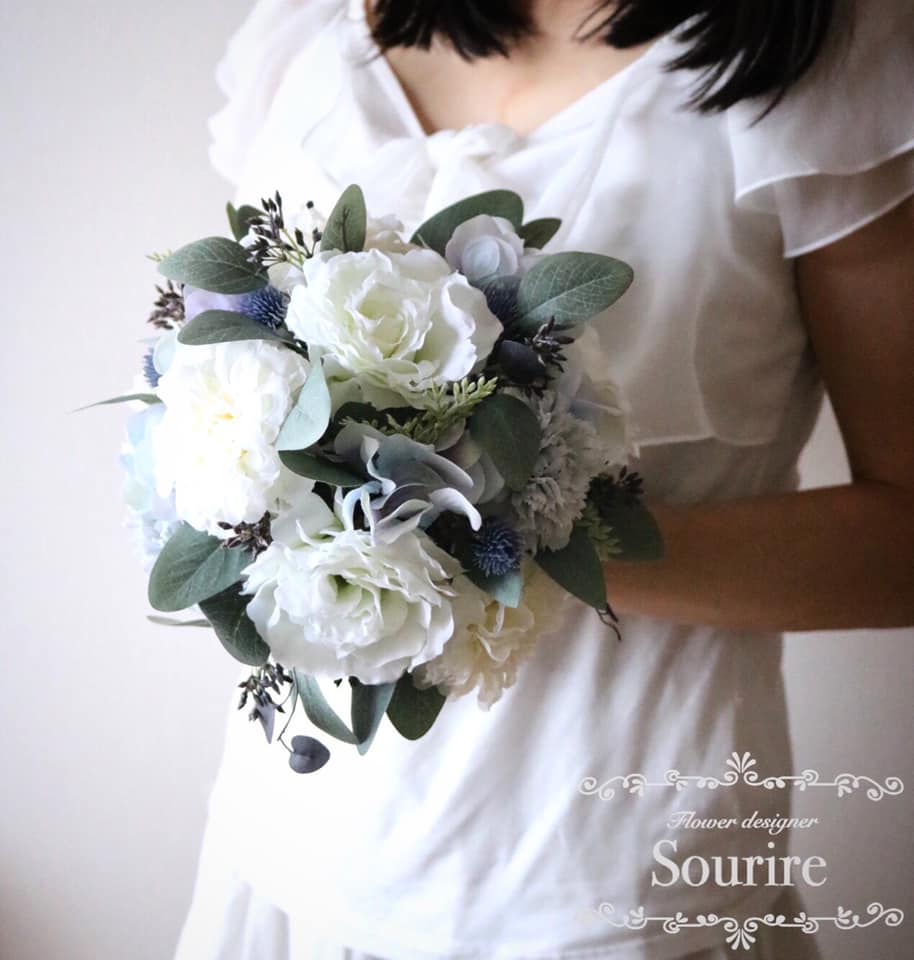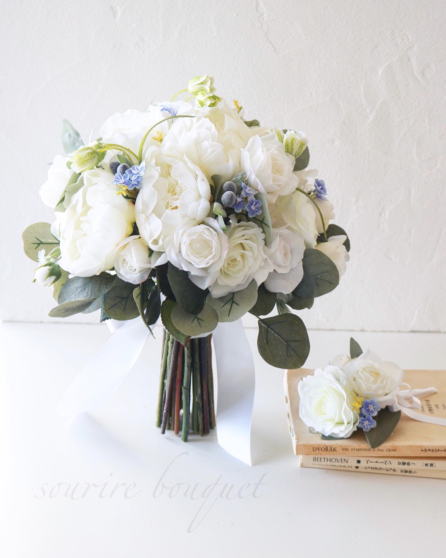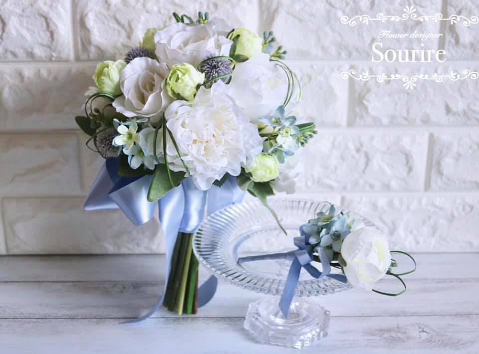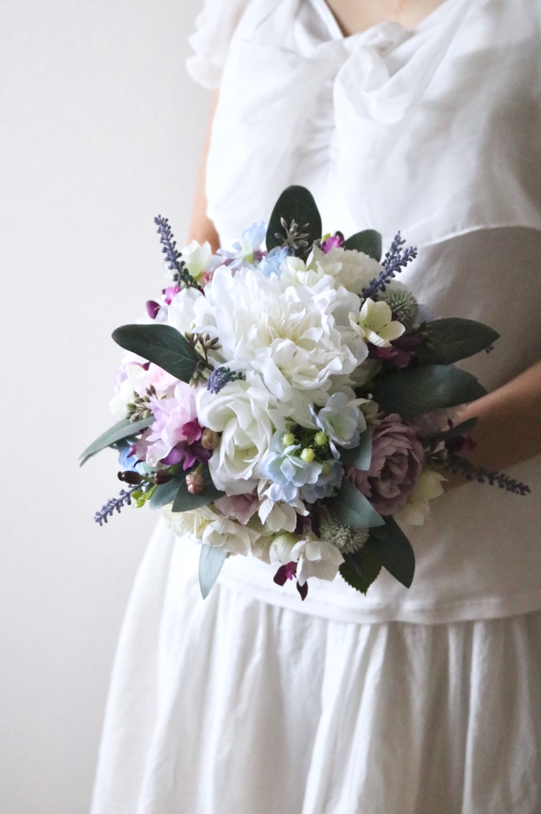 - 【r-9】白い芍薬と、水色と紫の落ち着いた色合いです。大人な花嫁さまへ。グレー系のドレスにも合いそうです。