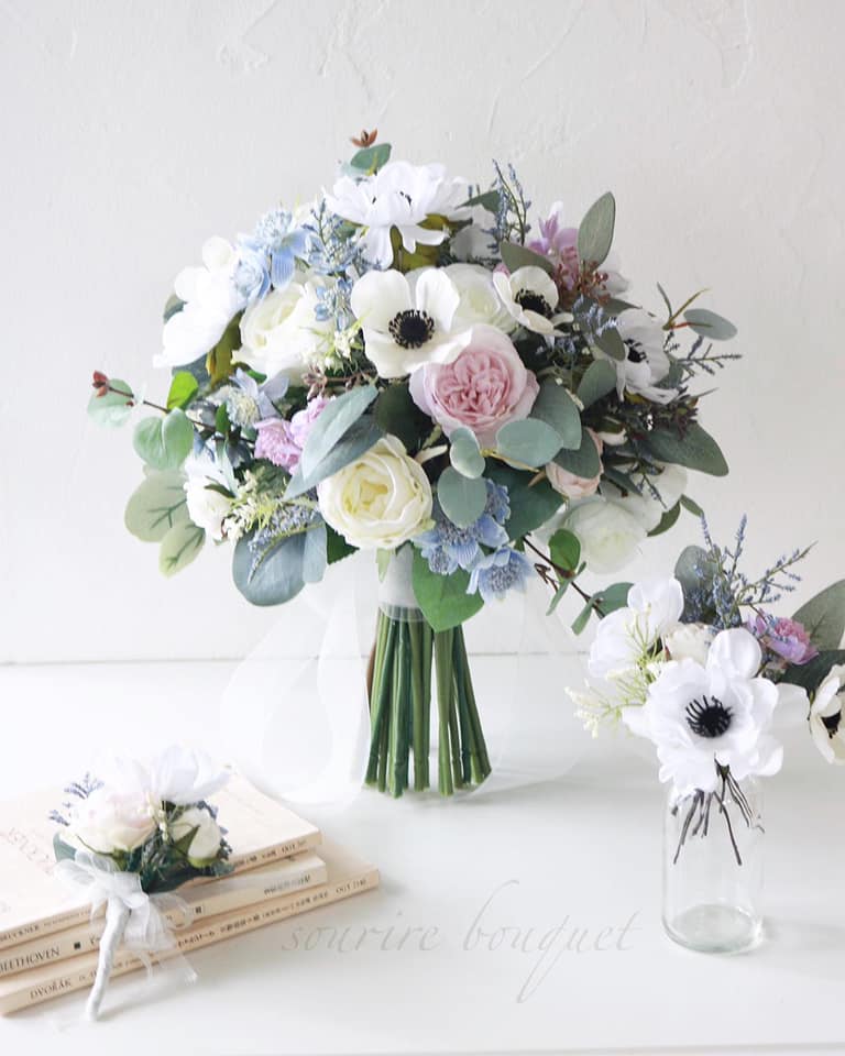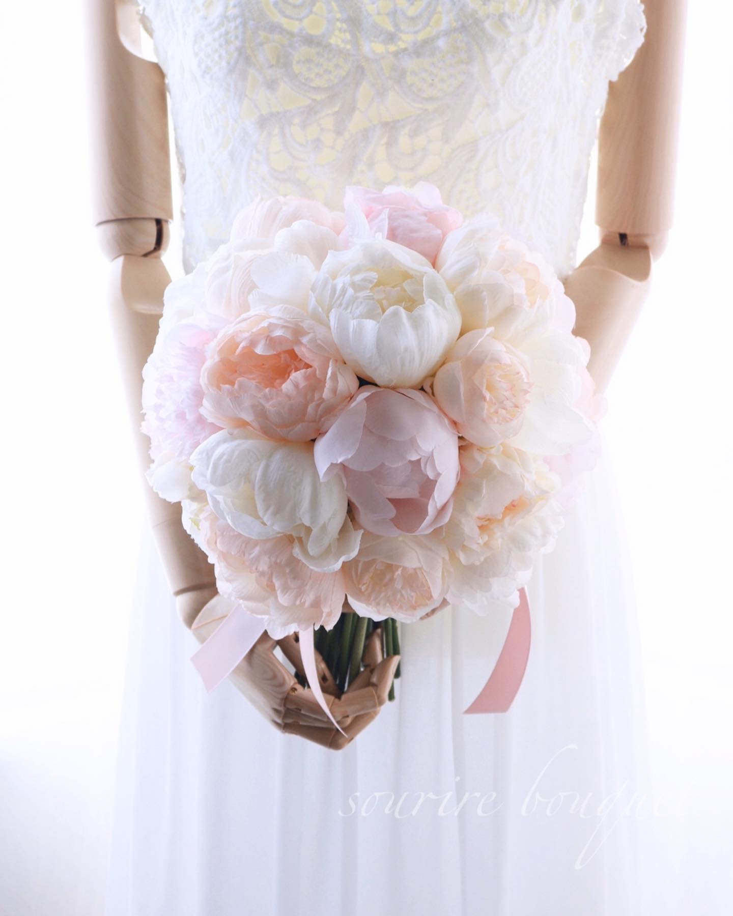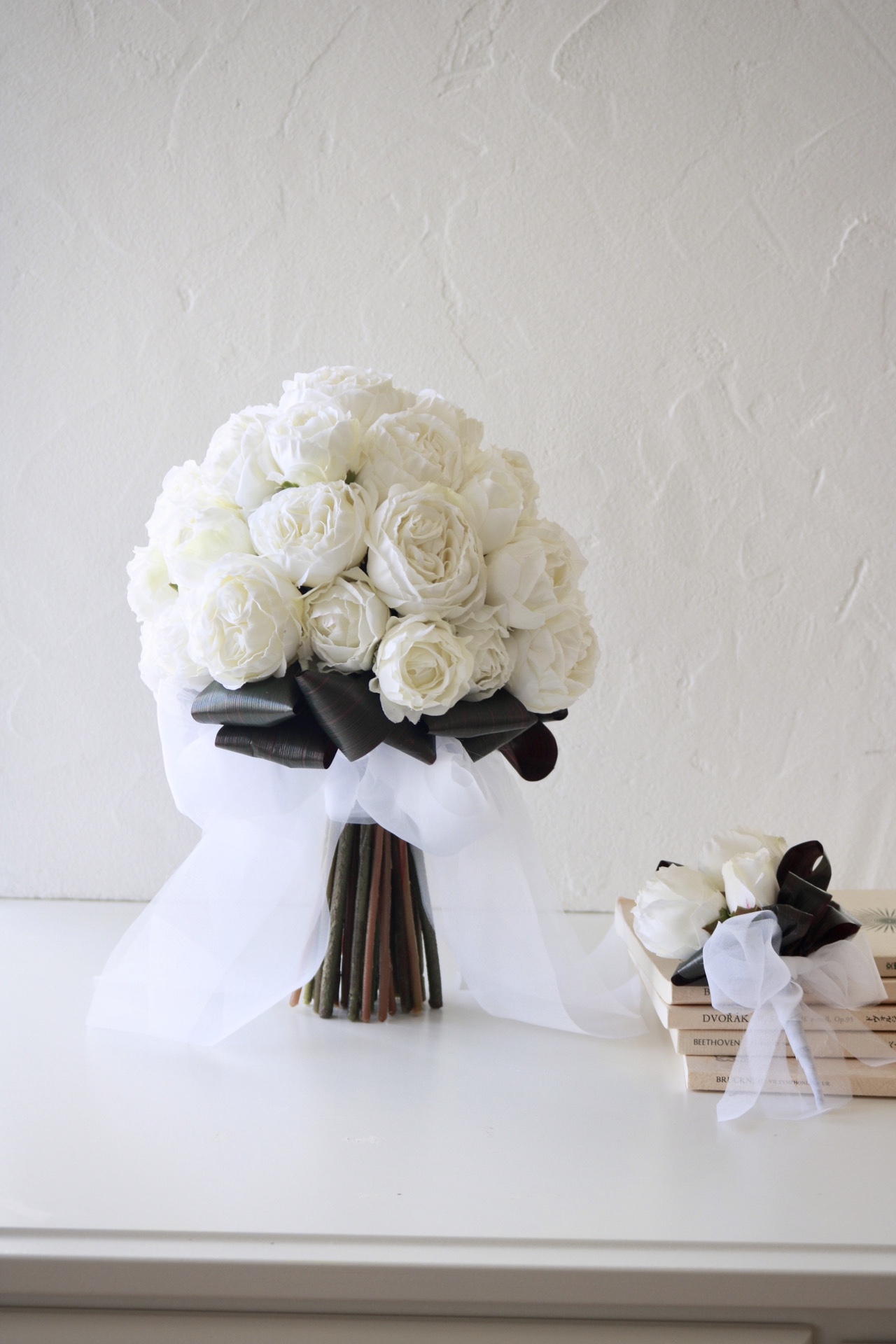 - 【r-9】白い芍薬と、水色と紫の落ち着いた色合いです。大人な花嫁さまへ。グレー系のドレスにも合いそうです。