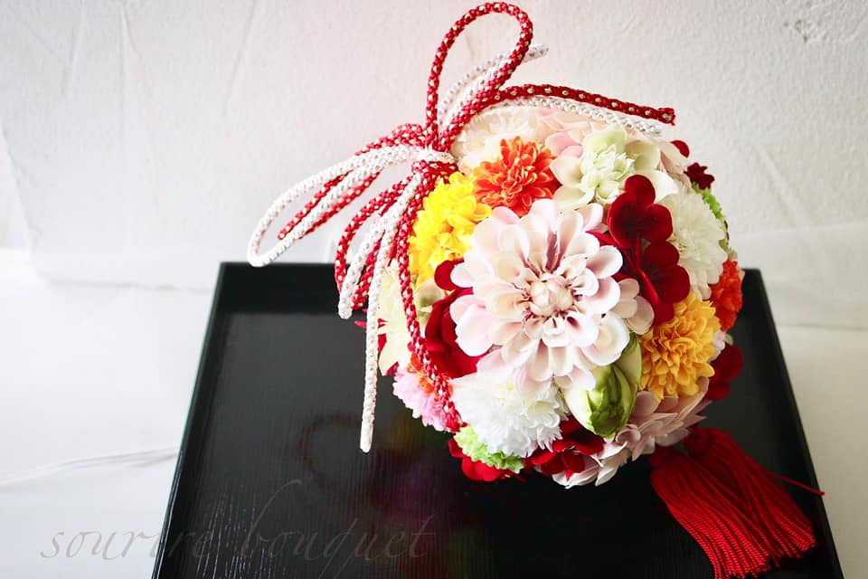 持ち手にリボンや組紐(日本伝統の工芸品で、細い絹糸や綿糸を組み上げた紐 )、タッセルなどがあしらわれたボールブーケは、白無垢や色打掛などに良く似合います。