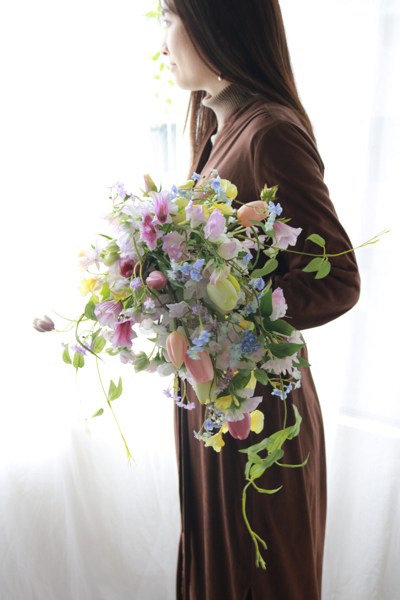 長いアームブーケは、自然と両手で抱えるようなカタチになります。