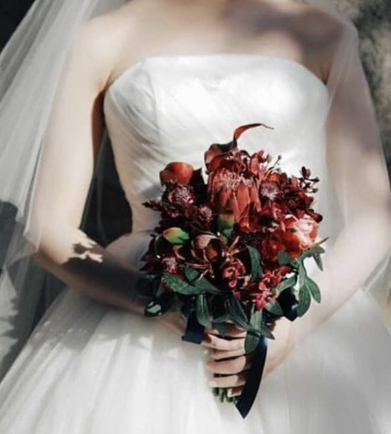 - カラーとアンスリウムを使った大人っぽいアームブーケ